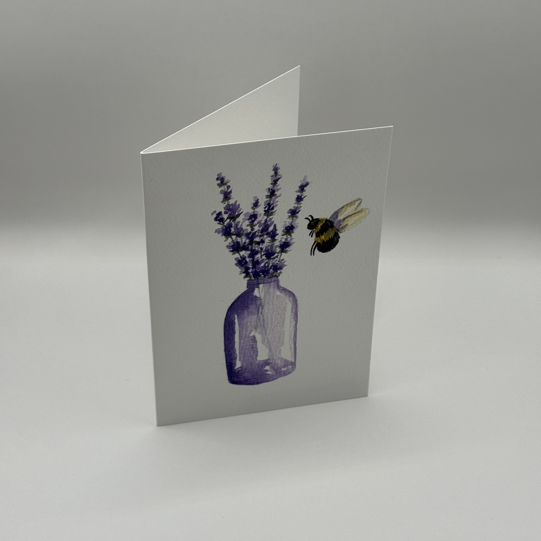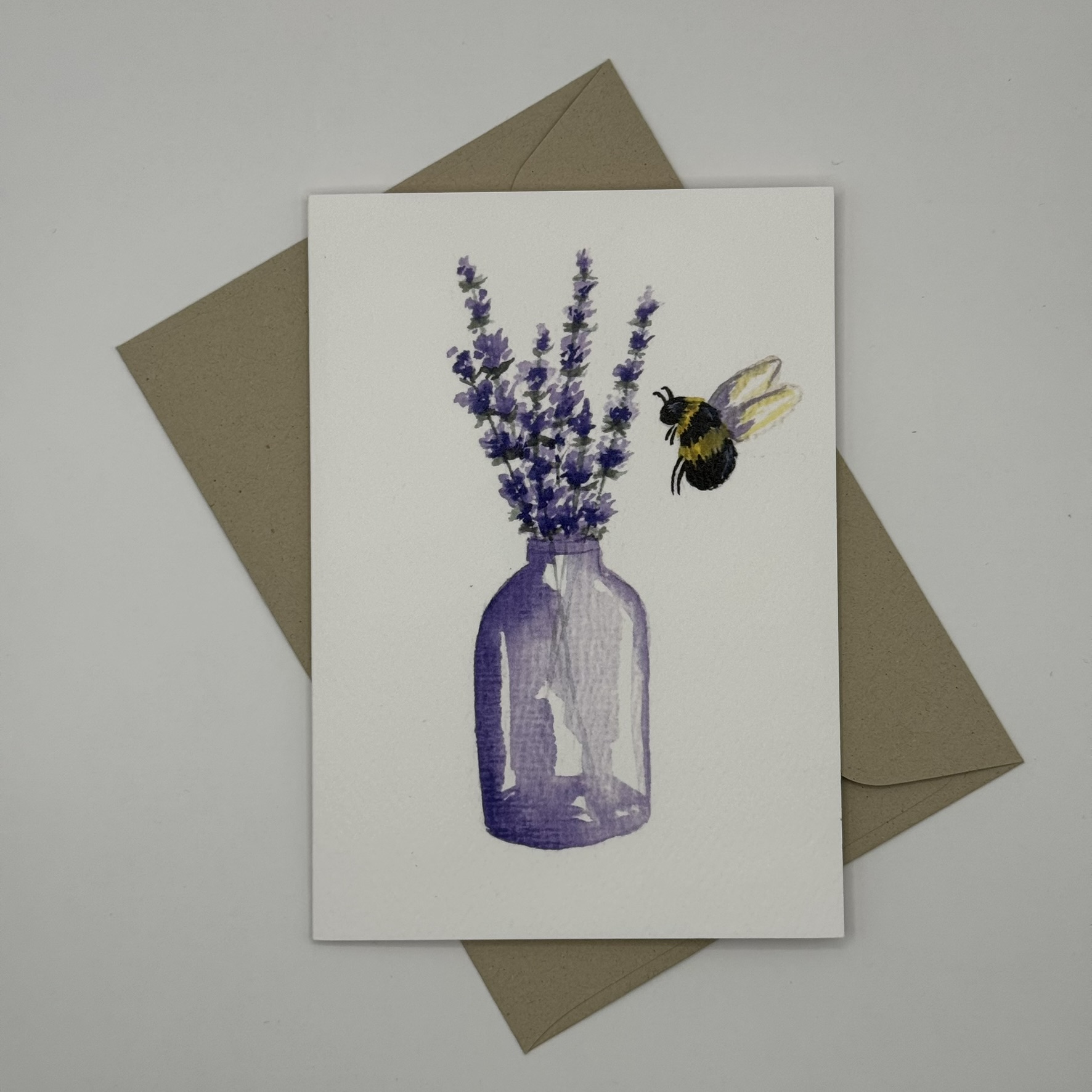 Ein zarter Lavendelstrauss mit summender Hummel – eine handgemalte Karte voller Sommerduft und Leichtigkeit.