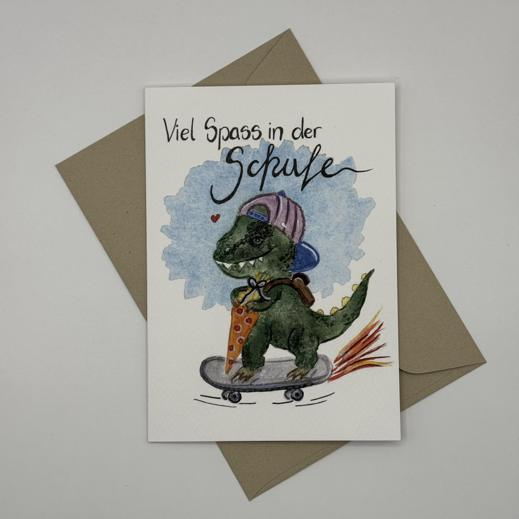 Ein cooler Dino mit Schultüte und Skateboard – für Kinder, die mit Abenteuerlust in die Schule starten.