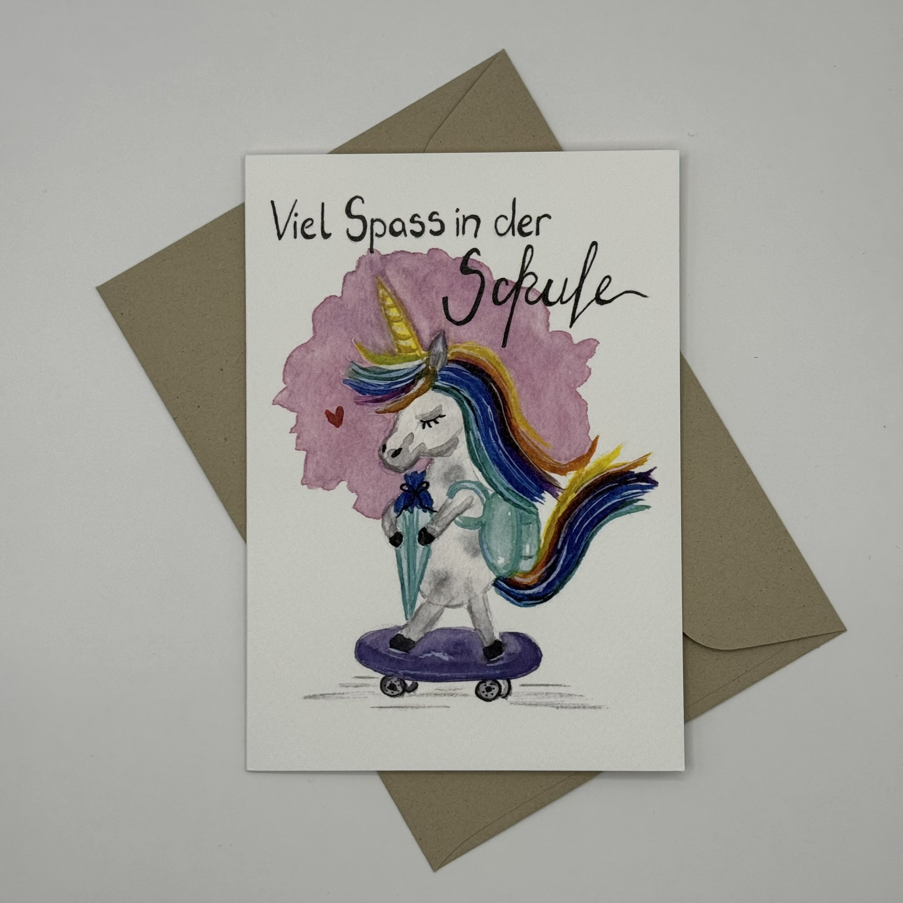 Ein fröhliches Einhorn auf dem Skateboard – die ideale Karte für kleine Träumer zum Schulanfang.